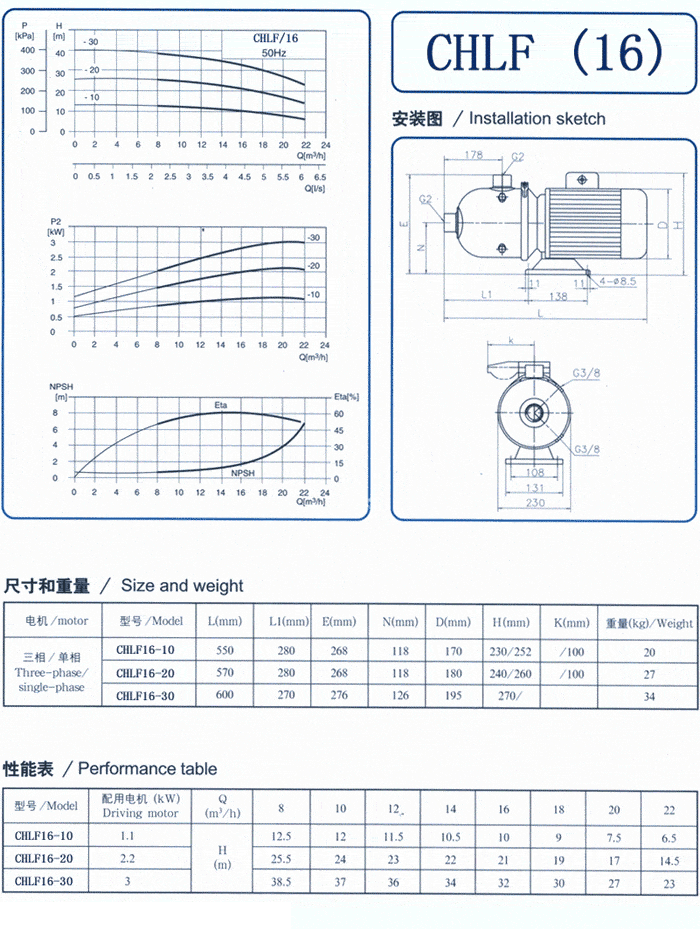 CHL,CHLK和CHLF(T)輕型臥式多級離心泵采用了機械密封。泵的過流部件均采用不銹鋼材料(304或316)制成,具有低噪音,耐輕腐蝕,外形美觀、體積小、重量輕、使用壽命長等特點。